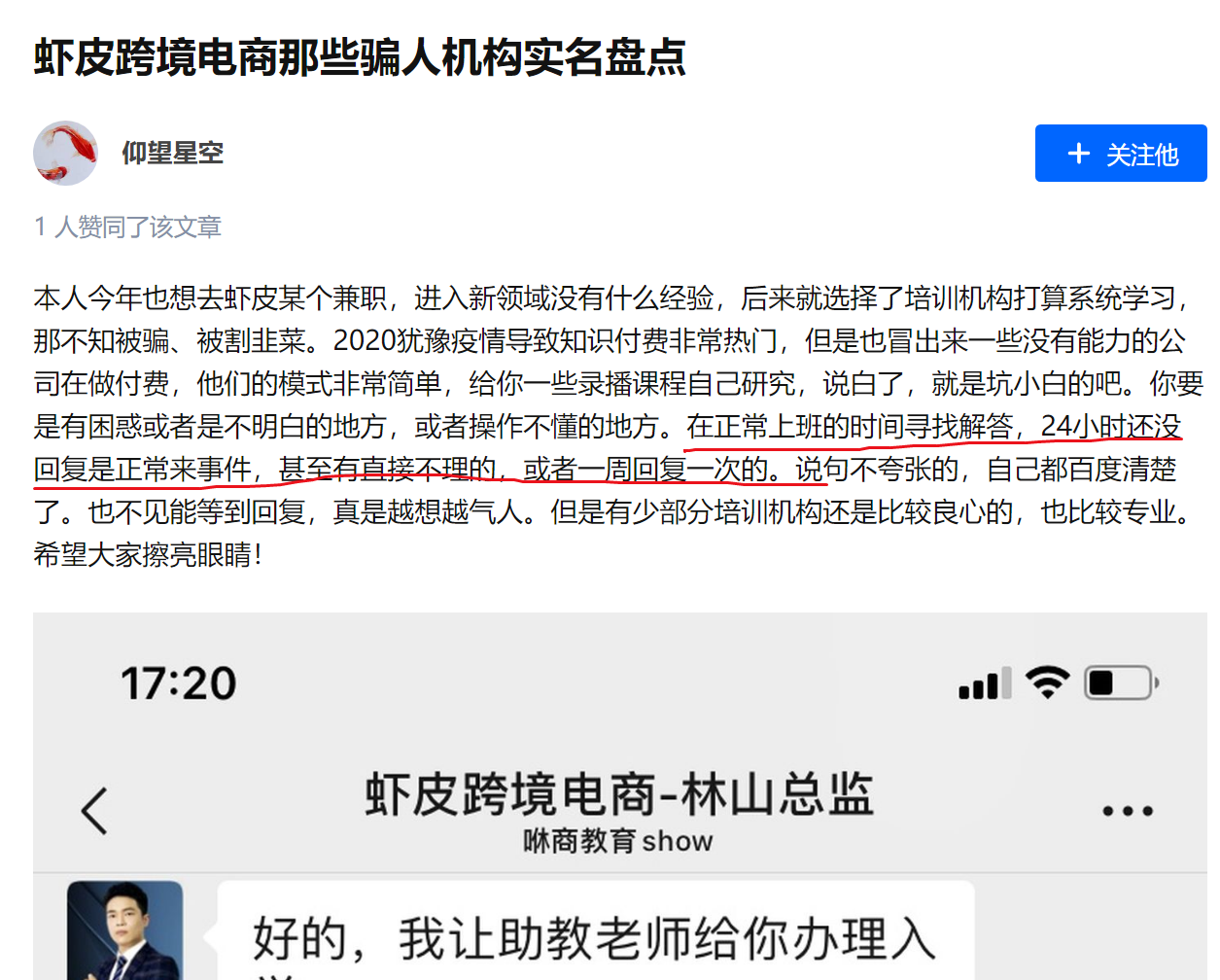 其实,在听的过程中整体还是觉得有点儿小心动的。不过,咱也过了冲动的年纪了,年轻时候因为冲动已经交过太多次和太多的学费;另外,现在信息多发达啊,在他边促单的时候,我就边百度查询虾皮shopee跨境电商培训是不是靠谱了,后面我会分享一部分查到的截图给大家。